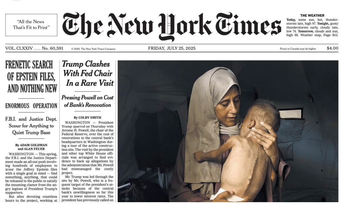 Photo: Front page of the New York Times, July 25, 2025, falsely claiming a child in Gaza with a muscular disorder was suffering from Israeli induced starvation.
